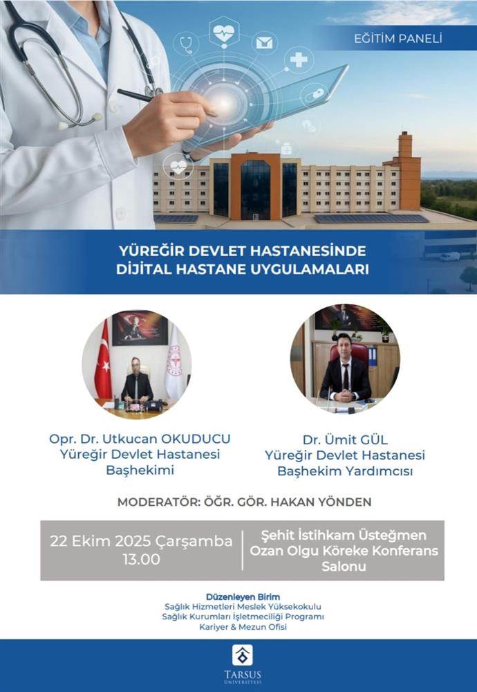 Sağlık Hizmetleri Meslek Yüksekokulu Sağlık Kurumları İşletmeciliği Programı ile Kariyer ve Mezun Ofisi iş birliğinde düzenlenen “Yüreğir Devlet Hastanesinde Dijital Hastane Uygulamaları” başlıklı eğitim paneli, sağlık hizmetlerinde dijital dönüşüm süreçlerine ilişkin güncel uygulamaların ele alınmasını amaçlamaktadır.